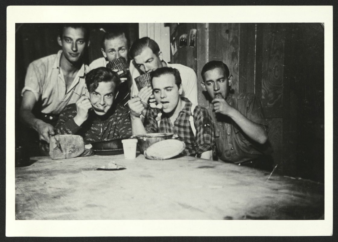 Companies also had photographs taken for propaganda purposes. These photographs whitewash the living and working conditions of the forced labourers and are intended to demonstrate the orderly organisation of the work in order to present the company and the employer in a positive light. The photograph selected here shows a group of women, children and men from the Soviet Union arriving at Meinerzhagen in the Sauerland region of Germany on 29 April 1944. Some of them are showing off the food they have just received. At the time the photo was taken, this group had already undergone the degrading process of registration at the transit camp in Soest. There they had been “chosen” by “their” employer and taken to a company camp for Soviet forced labourers. Now the men, women and children are standing in front of a barrack hut, waiting to be assigned to their accommodation and workplace.