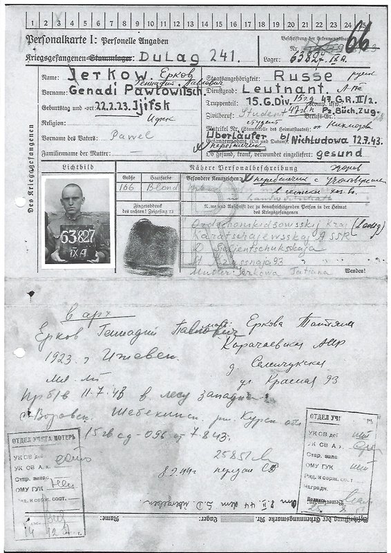 Am 12. Juli 1943 nahmen Wehrmachtssoldaten Gennadij Jerkow gefangen. Er wurde vorübergehend im Durchgangslager 241 bei Simferopol in der heutigen Ukraine interniert. Im Herbst 1943 traf er nach einem langen Transport, bei dem viele sowjetische Kriegsgefangene starben, im STALAG IX A Ziegenhain ein. Gennadij Jerkow wurde dort wie alle Kriegsgefangenen registriert und anschließend "desinfiziert".