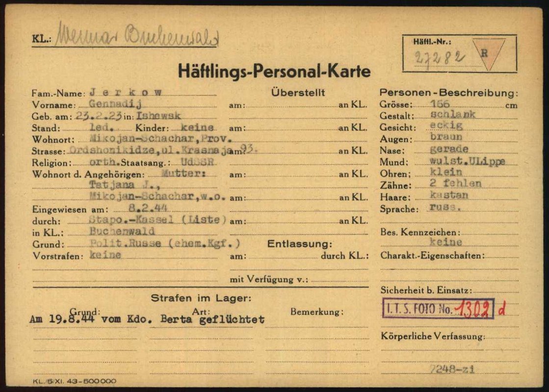 Am 8. Februar 1944 wurde Gennadij Jerkow mit 37 anderen sowjetischen Kriegsgefangenen aus den Behringwerken in das Konzentrationslager Buchenwald deportiert. Auf der sogenannten Häftlingspersonalkarte, die dort für ihn erstellt wurde, wird er als "Politischer Russe und ehemaliger Kriegsgefangener" geführt. Darüber hinaus finden sich nur spärliche Informationen über ihn.