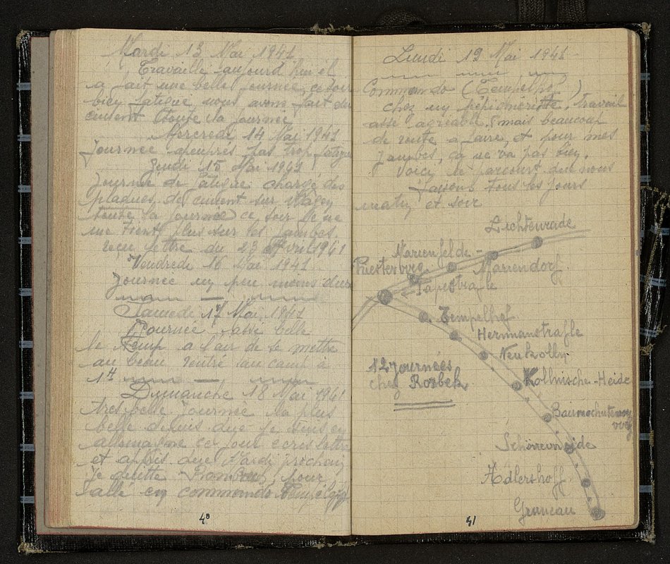 All seine Erlebnisse hielt Jean-René in Notizbüchern fest. Fast täglich notierte er seine 10- bis 12-stündigen Arbeitstage – sechs Tage die Woche. Er beschrieb, wo er zu arbeiten hatte, wie die Arbeitskommandos zur Arbeit transportiert wurden, seine Unterkünfte, seine Kontakte zu den Mitgefangenen, seine Ernährung, seine Krankheiten, seine freie Zeit, wann Pakete oder Briefe ankamen, wie lange sie unterwegs waren, was sie enthielten oder was er sich gewünscht hätte. Je länger der Krieg dauerte, desto mehr nächtliche Luftangriffe erwähnt er. Im Mai 1941 skizzierte er die Stationen der S-Bahnstrecke, die er von seinem Unterkunftslager in Grünau bis zur Arbeitsstelle in Lichtenrade zurücklegte. Sein Kommando arbeitete dort in einer Gärtnerei.