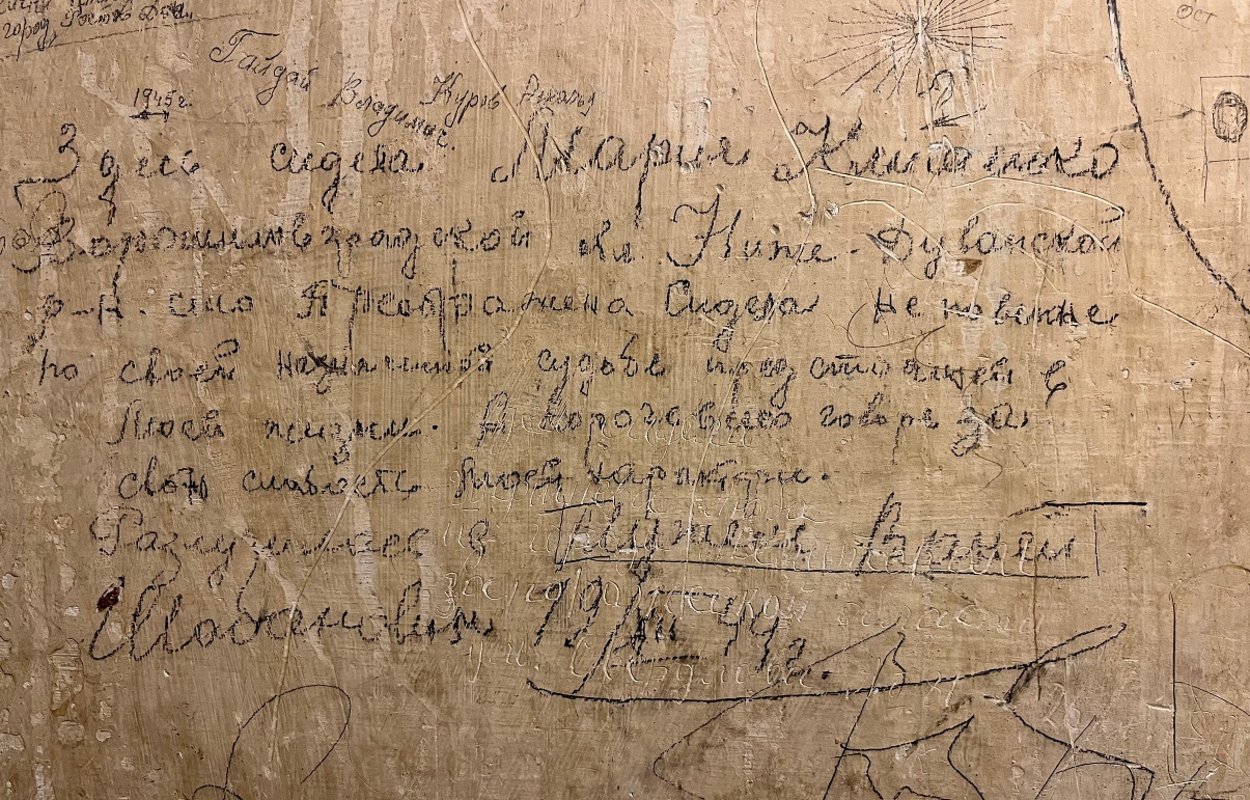 "Hier hat Marija Klimenko gesessen aus dem Gebiet Woroschilowgrad, Bezirk Nishneduwansk, Dorf Preobrashena. Sie hat unschuldig gesessen. Es ist mein vorgezeichnetes Schicksal, das meinem Leben bevorsteht. Kurz gesagt, wegen der Schwäche meines Charakters."