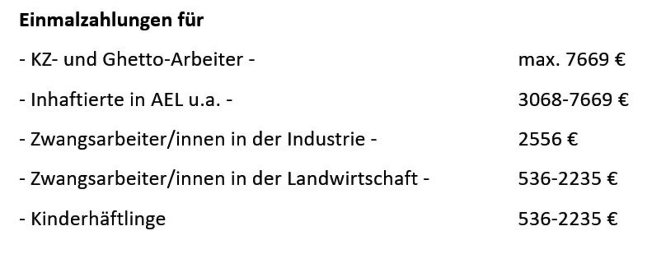Der Großteil der Menschen, die Zwangsarbeit leisten mussten, hat somit nie eine Entschädigung erhalten. Die Firmen, die Menschen während des Nationalsozialismus ausgebeutet haben, mussten nur einen Bruchteil ihres dadurch erwirtschafteten Profits abgeben.
